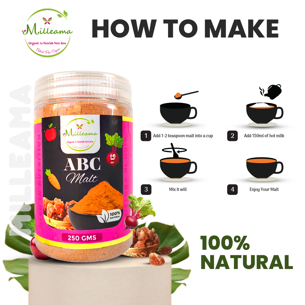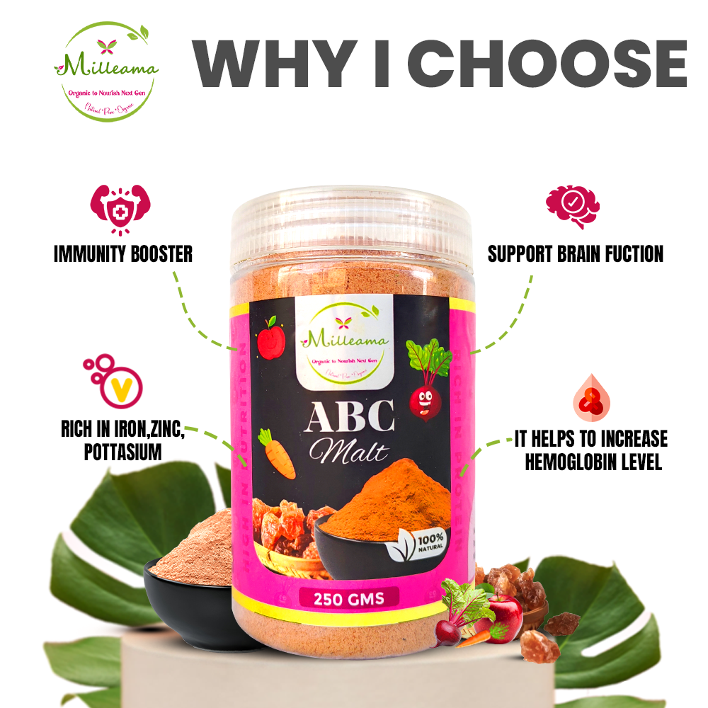 - ABC Malt is a vibrant mix of apple, beetroot, and carrot enriched with 12 powerful nuts and seeds. Packed with antioxidants, beta-carotene, and fiber, this natural supplement supports immunity, skin health, digestion, and energy levels. It’s sweetened with palm candy—making it a delightful choice for kids, adults, and elders alike.